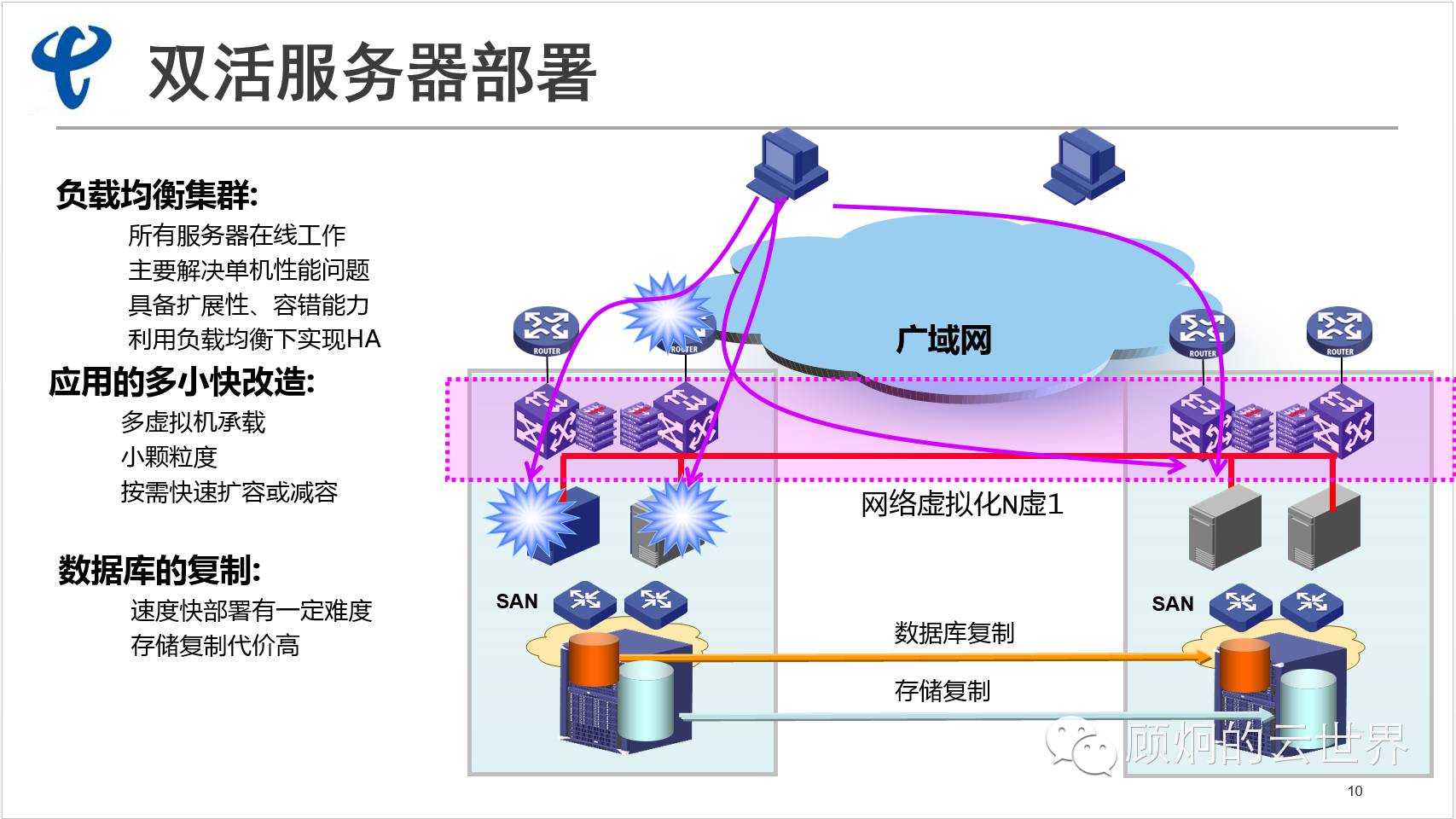双活服务器部署的原理主要是利用大二层网络并将防火墙、负载均衡全局部署并进行N虚1后分区配置。而一般系统往往有2部分的服务器组成:无状态的应用服务器和有状态的数据库服务器。将应用服务器按照需求分别部署在两个物理节点上,二个物理节点的服务器采取轮询或主备的方式工作;有状态的数据库服务器由于需要状态数据同步,可以采取数据库同步或存储复制同步的方式。实践证明,采用数据库同步方式同步时间短,成本低,能很好的满足双活部署的需要,但数据库同步部署有一定门槛。每个物理节点都有独立的出口和同一个上级网络连接,采用BGP协议。每个业务可以根据需要设定主路由,当上级网络出现异常,可以进行主备倒换。这样,不光资源池内网络有了双活保障,资源池的出口网络也有双活保障。