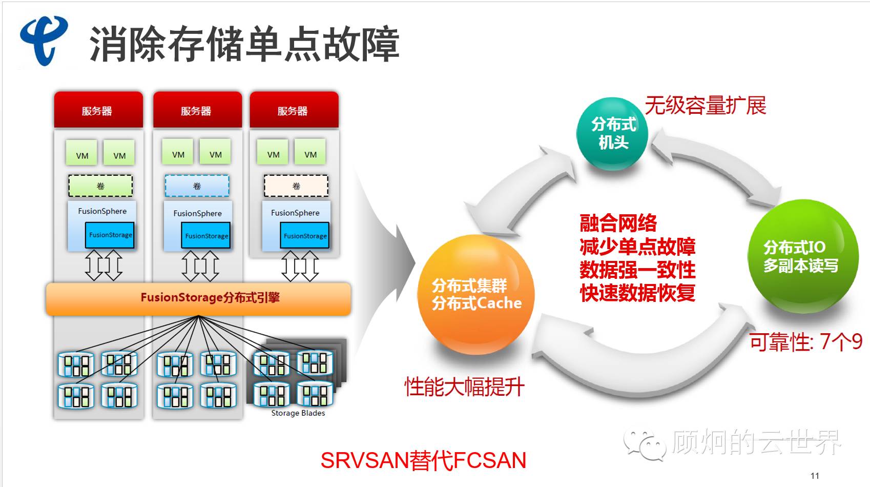 存储存在单点故障,将通过引入SRVSAN来解决;服务器会出现硬件故障、软件BUG和硬件驱动等问题,通过引入计算型定制化服务器来解决。