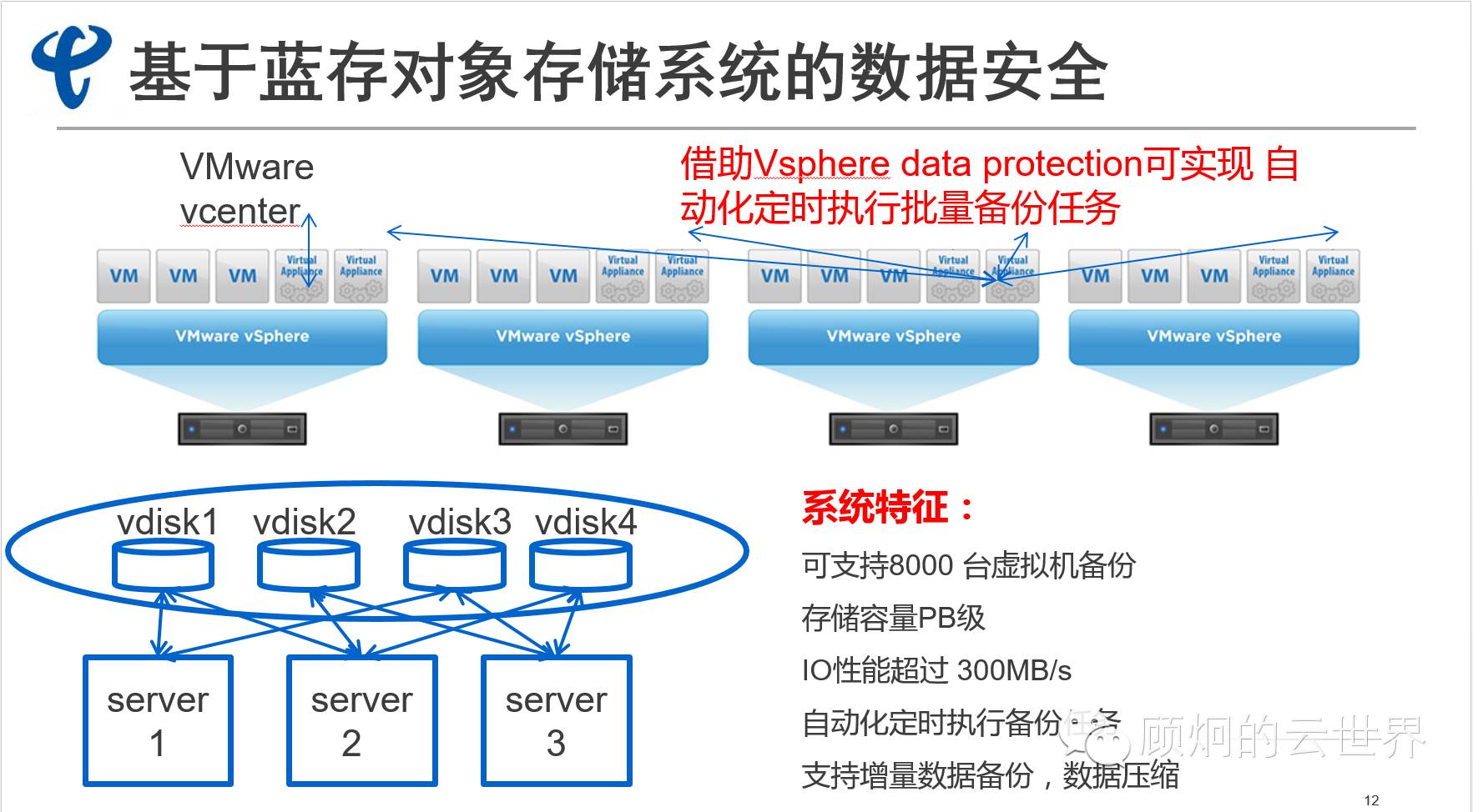通过基于开源ceph的对象存储,可以提供资源池内每台或每个用户一个备份路径,用户可以按照原有的备份习惯定义自动或手动的备份任务,实现数据的容灾备份。系统还根据虚拟机特有的特性,利用VMWARE提供的VDP工具,对虚拟文件(VMDK)进行自动全量或增量备份。目前可以支持8000台虚拟机的备份,IO性能超过300MB/s。这个存储还可以通过NFS接口的封装,提供NAS存储的服务。为资源池提供了独立的、廉价的存储资源服务。