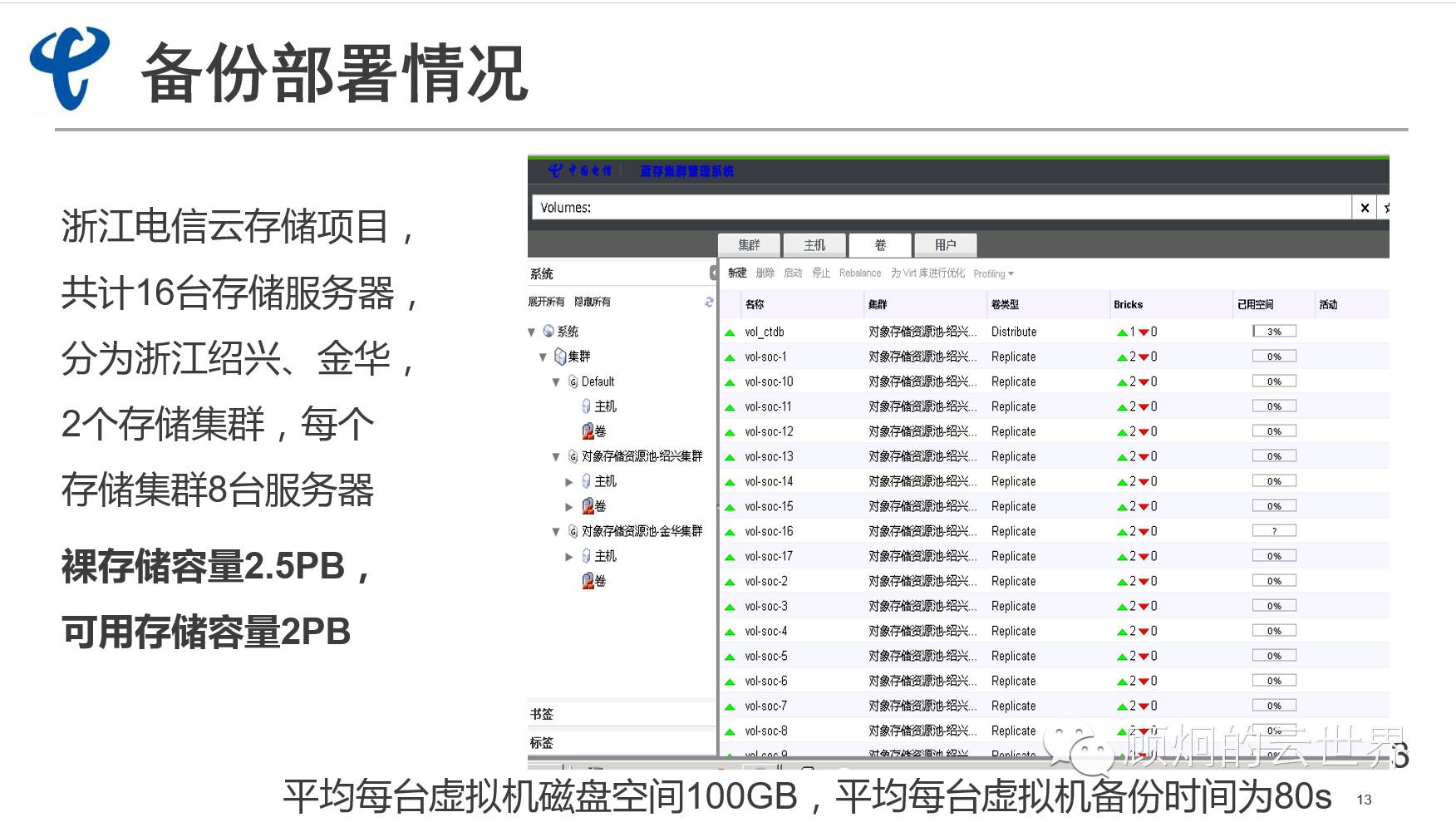 我们这次实施的是独立存储项目,采用的是异地数据备份,本地提供NAS服务的方案。即在绍兴和金华各部署8台35块4T硬盘的服务器的对象存储。绍兴存储备份金华节点服务器的数据,金华存储备份绍兴节点服务器的数据。而NAS存储的服务采用就近服务的方式,即绍兴的服务器使用绍兴的NAS服务,金华的服务器使用金华的NAS服务。经过测试平均每台虚拟机磁盘空间是100GB,每台虚拟机平均备份的时间为80s。