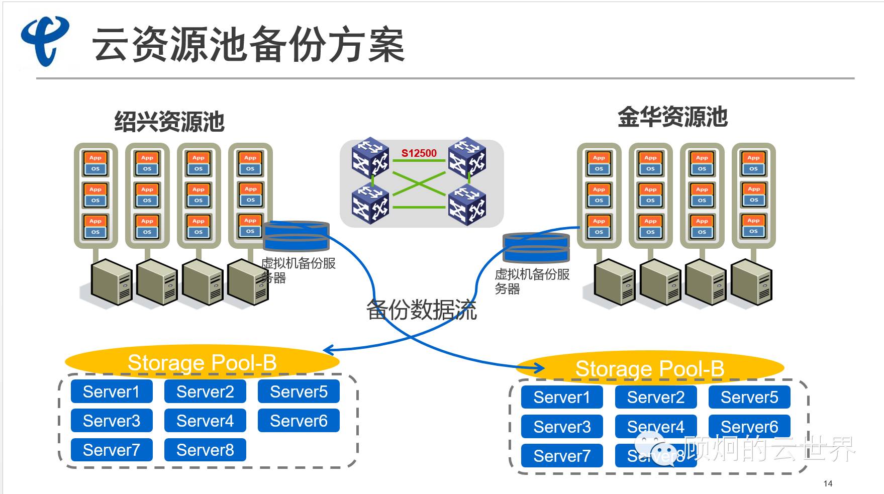 前几个ppt中,我简单介绍过双活实现的方法,但怎么样实现快速的系统容灾呢?其实就是利用蓝存实现的。我们知道,虚拟机是由CPU+内存+虚机文件组成的。把绍兴资源池内的虚机文件都备份在金华蓝存中。并根据原有的虚拟机的配置,在金华节点利用蓝存的NAS接口配置同样的虚拟机。但这些虚拟机日常是不开机的,并不消耗资源。在灾难发生的时候能快速开启虚拟机,提供业务。由此看来,通过蓝存提供的容灾方案也是低成本的,避免了以前容灾方案中所有设备都必须冗余的高成本。
