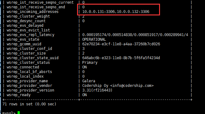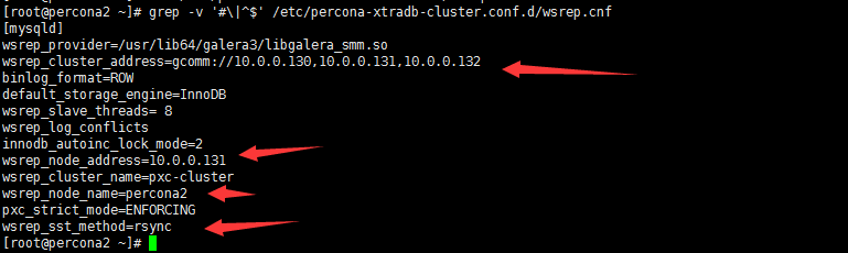 1 2 3 4 5 6 7 8 9 10 11 12 13 | [mysqld]wsrep_provider=/usr/lib64/galera3/libgalera_smm.sowsrep_cluster_address=gcomm://10.0.0.130,10.0.0.131,10.0.0.132binlog_format=ROWdefault_storage_engine=InnoDBwsrep_slave_threads= 8wsrep_log_conflictsinnodb_autoinc_lock_mode=2wsrep_node_address=10.0.0.131wsrep_cluster_name=pxc-clusterwsrep_node_name=percona2pxc_strict_mode=ENFORCINGwsrep_sst_method=rsync |