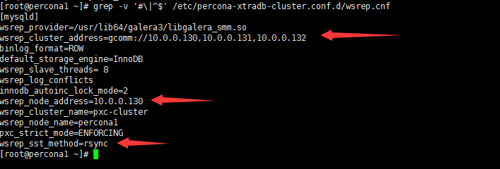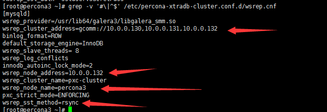 1 2 3 4 5 6 7 8 9 10 11 12 13 | [mysqld]wsrep_provider=/usr/lib64/galera3/libgalera_smm.sowsrep_cluster_address=gcomm://10.0.0.130,10.0.0.131,10.0.0.132binlog_format=ROWdefault_storage_engine=InnoDBwsrep_slave_threads= 8wsrep_log_conflictsinnodb_autoinc_lock_mode=2wsrep_node_address=10.0.0.132wsrep_cluster_name=pxc-clusterwsrep_node_name=percona3pxc_strict_mode=ENFORCINGwsrep_sst_method=rsync |