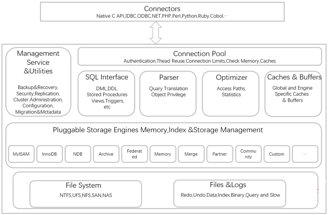 MySQL的架构不同于其他数据库,它的插件式的存储引擎架构可以在多种不同场景中应用并发挥良好作用。这种架构可以根据业务的需求和实际需要选择合适的存储引擎。