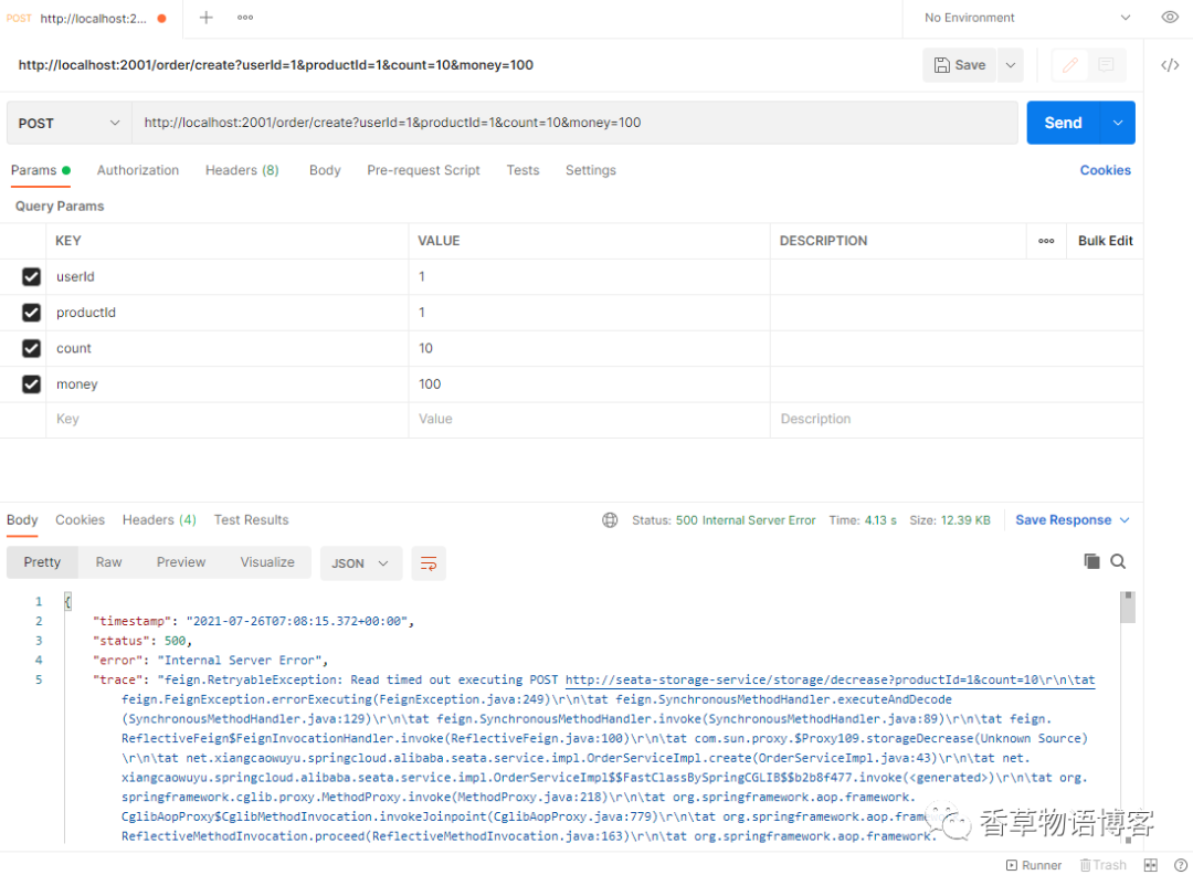 @Service@Slf4jpublic class AccountServiceImpl implements IAccountService {@Resourceprivate AccountDao accountDao;@Override// @Transactionalpublic int decrease(Long userId, BigDecimal money) {log.info("--------->storage-------decrease获取xid:" + RootContext.getXID());//模拟报错int age = 10 / 0;return accountDao.decrease(userId, money);}}