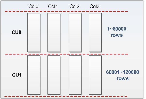列存引擎的存储基本单位是CU(Compression Unit,压缩单元),即表中一列的一部分数据组成的压缩数据块。行存引擎中是以行作为单位来管理,而当使用列存储时,整个表整体被按照不同列划分为若干个CU,实例如图9-25所示。