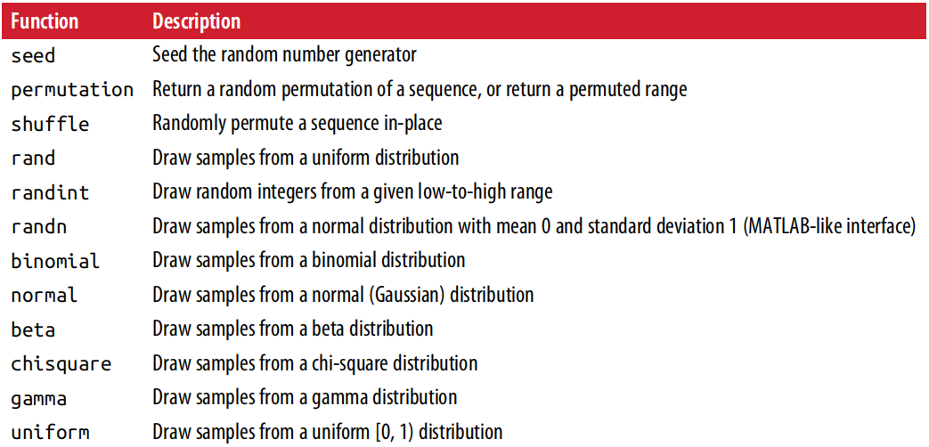 numpy.random模块对Python内置的random进⾏了补充,增加了⽤于⾼效⽣成多种概率分布的样本值的函数。