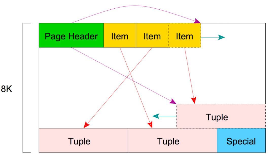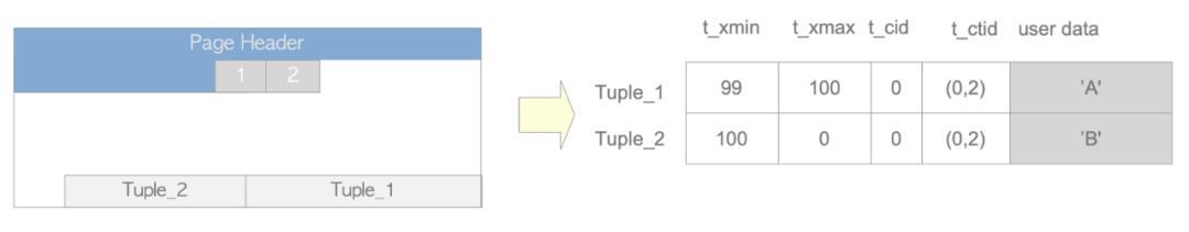 PostgreSQL中表中的每条记录都会记录版本信息,版本信息主要包括插入记录的事务ID(cmin)、删除记录事务ID(cmax).记录的Common Id(cid)和一些Hints信息。PG的行记录可见性函数根据这些信息、clog、快照来判断记录的可见性。PG数据采用页面方式进行存储,页面从前往后保存记录的位置信息,从后往前行数据,中间则是页面的空闲空间。