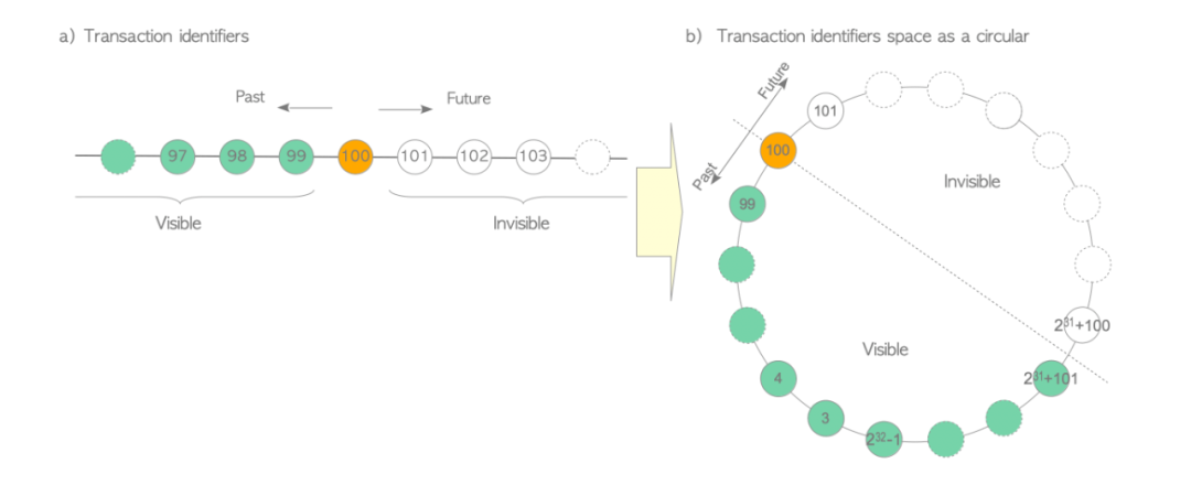 Postgres事务采用了事务ID(txid)作为唯一标识,这是一个4个字节的整数,最大的是txid为42亿。其中PostgreSQL中保留了txid=0代表无效的txid;txid=1代表初始化启动txid(数据库集群初始化过程中出现);txid=2代表冻结的txid.PostgreSQL中txid视为一个环,划分为2个部分,前21个txid属于过去;后21个事务id属于未来。
