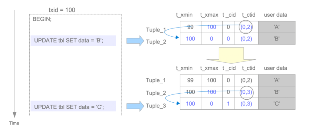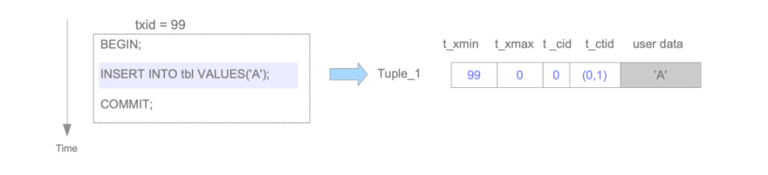 t_xmin=当前事务,t_xmax=0,t_cid=0,t_ctid=(0,1)