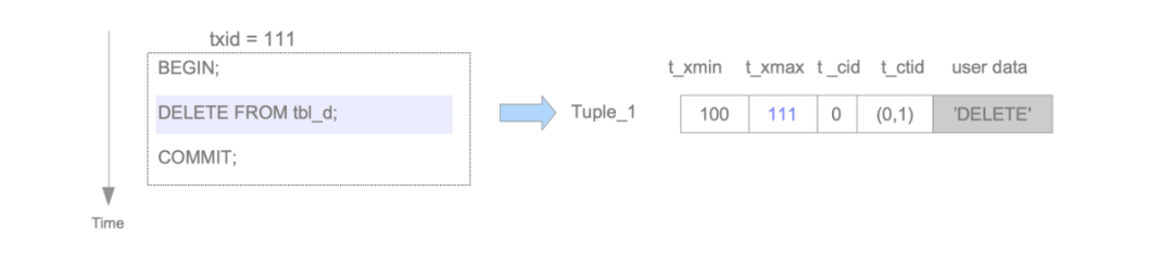,插入过程中t_xmax永久设置为0.当一行数据被删除时候,PostgreSQL不会立即删除,而是打上删除的标记,后续由vacuum进程回收删除记录的空间。行数据删除会在数据行的header中设置t_xmin={开始的事务id},t_xmax={删除数据整个事务的id}