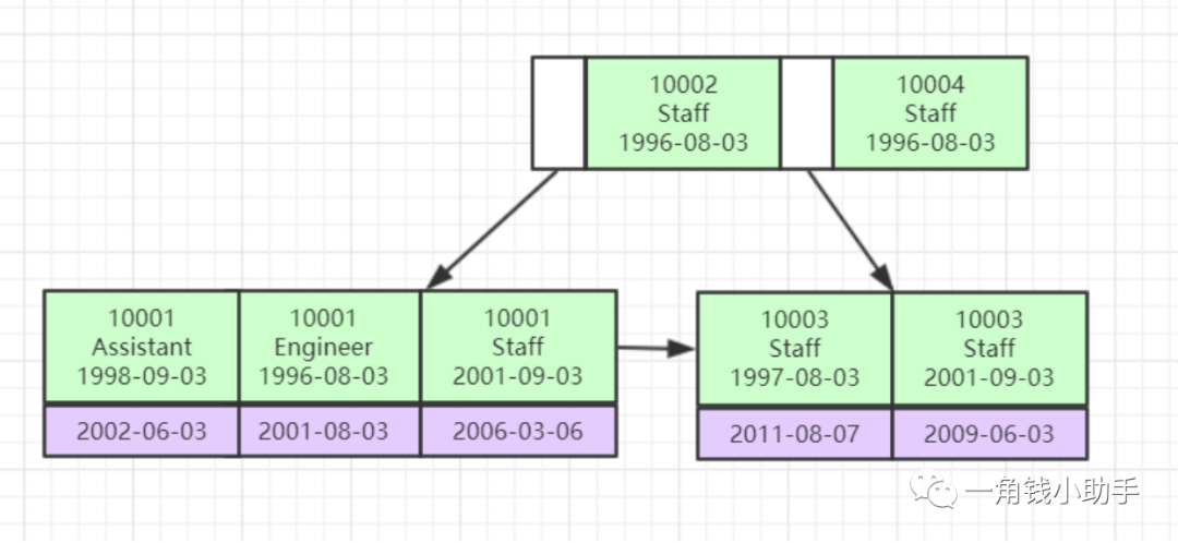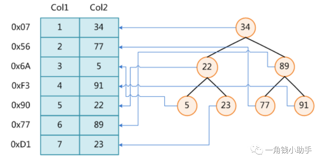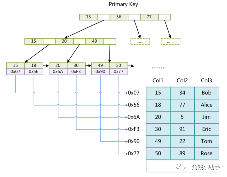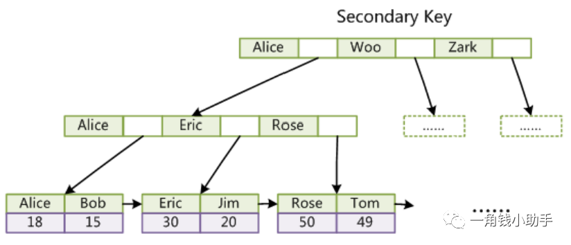 数据库中的B+Tree索引可以分为聚集索引(clustered index)和 辅助索引(secondary index)。上面的B+Tree示例图在数据库中的实现即为「聚集索引」,聚集索引的B+Tree中的叶子节点存放的是整张表的行记录数据。