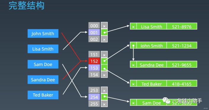 「定义」:散列表(Hash table,也叫哈希表),是根据关键码值(Key value)而直接进行访问的数据结构。也就是说,它通过把关键码值映射到表中一个位置来访问记录,以加快查找的速度。这个映射函数叫做散列函数,存放记录的数组叫做散列表。 对目标值进行hash运算得到hash值和数据磁盘指针地址保存到hash表,这样就达到快速定位数据位置。