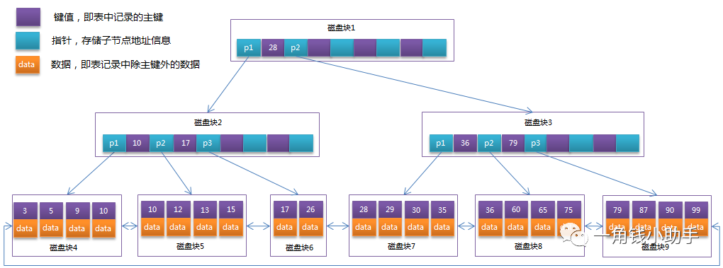 每个节点占用一个盘块的磁盘空间,一个节点上有两个升序排序的关键字和三个指向子树根节点的指针,指针存储的是子节点所在磁盘块的地址。两个关键词划分成的三个范围域对应三个指针指向的子树的数据的范围域。以根节点为例,关键字为17和35,P1指针指向的子树的数据范围为小于17,P2指针指向的子树的数据范围为17~35,P3指针指向的子树的数据范围为大于35。
