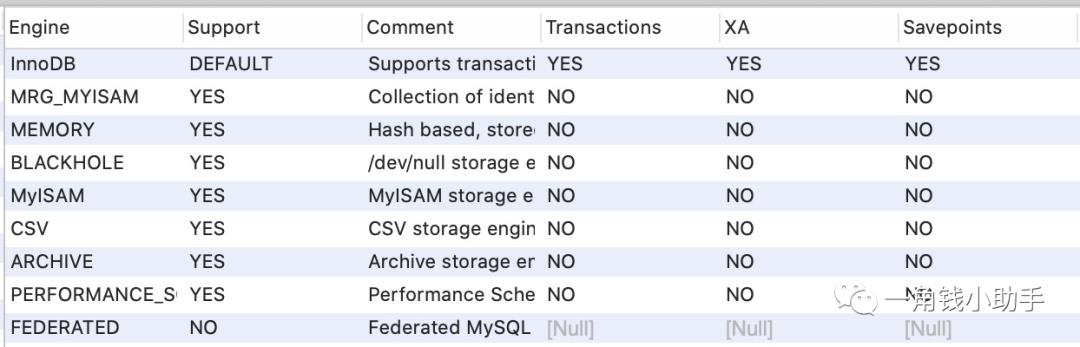 支持多种类型的数据库引擎,可分别根据各个引擎的功能和特性为不同的数据库处理任务提供各自不同的适应性和灵活性。在 MySQL 中,可以利用 SHOW ENGINES
