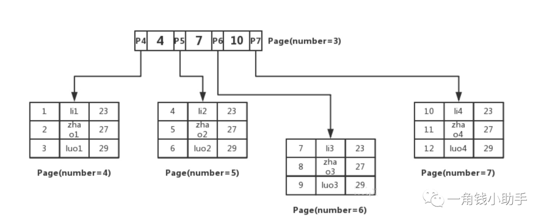 如果数据库只按这样的方式存储,那么如何查找数据就成为一个问题,因为我们不知道要查找的数据存在哪个页中,也不可能把所有的页遍历一遍,那样太慢了。所以人们想了一个办法,用B+树的方式组织这些数据。如图所示: