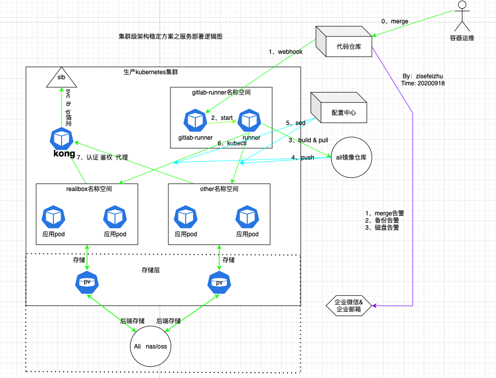 根据发版流程的浅析,再根据逻辑图可以明确发版流程。在这里看到我司使用的是Kong代替Nginx,做认证、鉴权、代理。而SLB的IP绑定在Kong上。0,1,2属于test job;3属于build job;4,5,6,7属于change pod 阶段。并非所有的服务都需要做存储,需要根据实际情况来定,所以需要在kubernetes.sh里写判断。在这里我试图使用一套CI应用与所有的环境,所以需要在kubernetes.sh中用到的判断较多,且.gitlab-ci.yml显得过多。建议是使用一个CI模版,应用于所有的环境,毕竟怎么省事怎么来。还要考虑自己的分支模式,具体参考:https://www.cnblogs.com/zisefeizhu/p/13621797.html