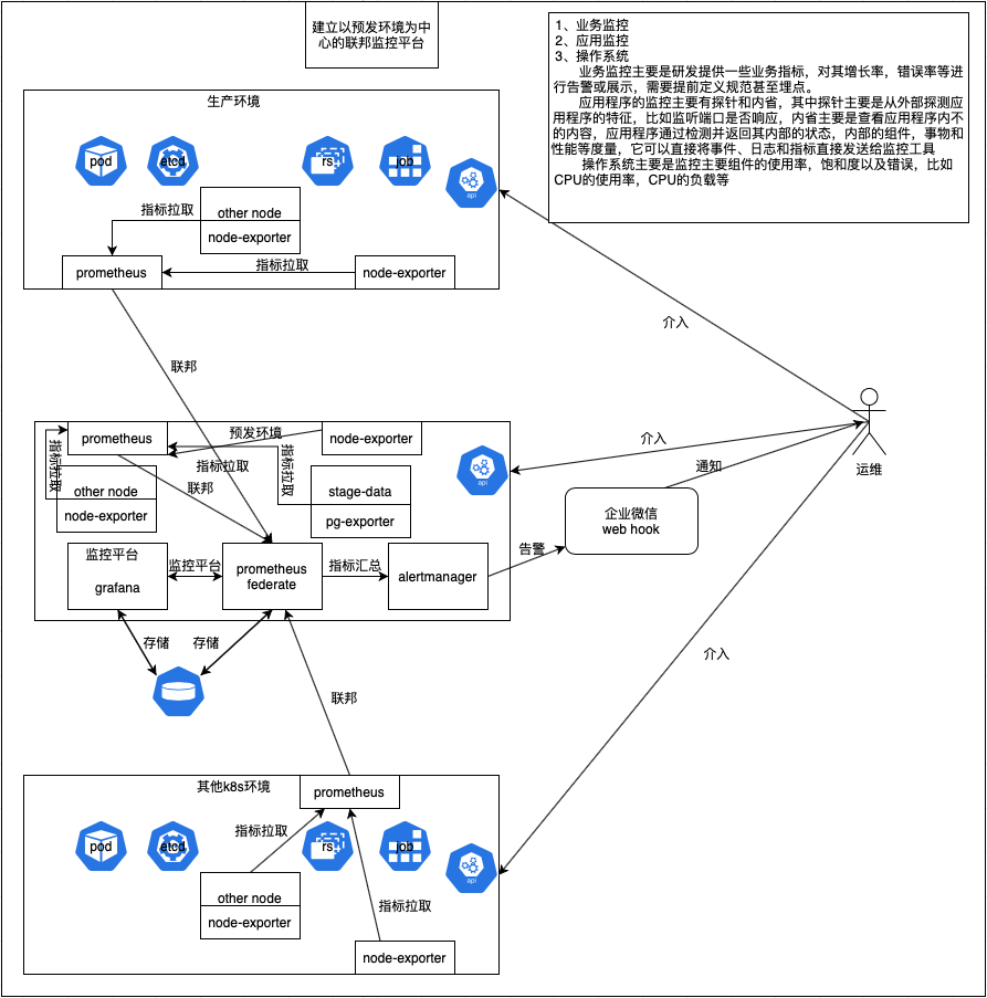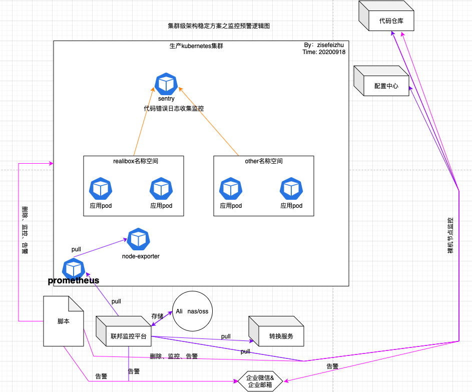 浅析:总的来说,我这里使用到的监控方案是Prometheus + Shell脚本或Go脚本+ Sentry。使用到的告警方式是企业微信或者企业邮箱。上图三种颜色的线代表三种监控方式需要注意。脚本主要是用来做备份告警、证书告警、抓贼等。Prometheus这里采用的是根据Prometheus-opertor修改的Prometheus资源清单,数据存储在NAS上。Sentry严格的来讲属于日志收集类的平台,在这里我将其归为监控类,是因为我看中了其收集应用底层代码的崩溃信息的能力,属于业务逻辑监控,旨在对业务系统运行过程中产生的错误日志进行收集归纳和监控告警。