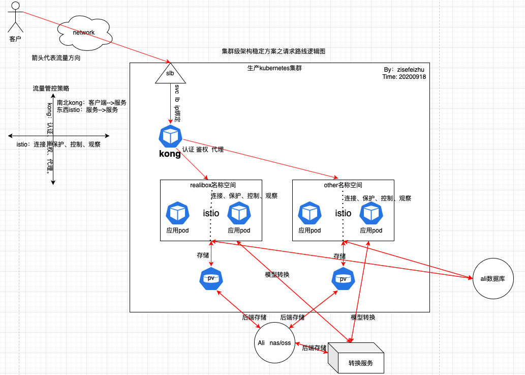浅析:客户经过Kong网关鉴权后进入特定名称空间(通过名称空间区分项目),因为服务已经拆分为微服务,服务间通信经过Istio认证、授权,需要和数据库交互的去找数据库,需要写或者读存储的去找PV,需要转换服务的去找转换服务......然后返回响应。