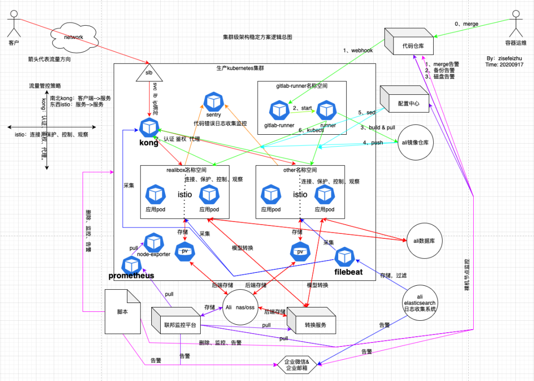 综上所述,构建以:以Kubernetes为核心的CI/CD发版流程、以Prometheus为核心的联邦监控预警平台、以Elasticsearch为核心的日志收集系统、以语雀为核心的文档管理中心、以Kong及Istio为核心的南北东西流量一体化服务,可以在高平发,高可靠性上做到很好保障。