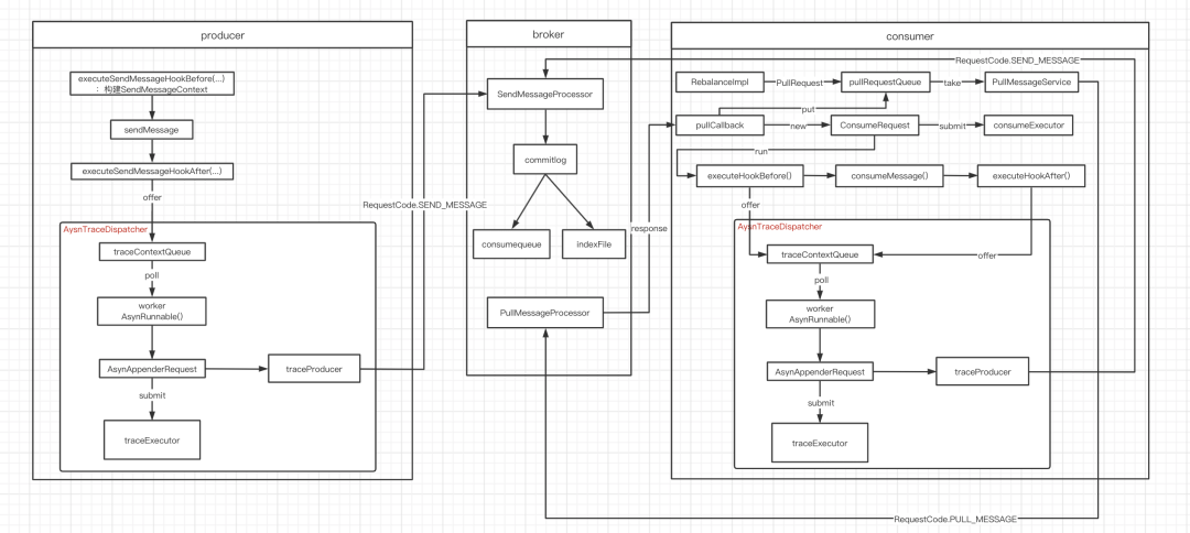 producer端在发送消息后会将TraceContext添加到traceContextQueue队列中 consumer端在消费消息前后会分别向traceContextQueue队列中添加TraceContext