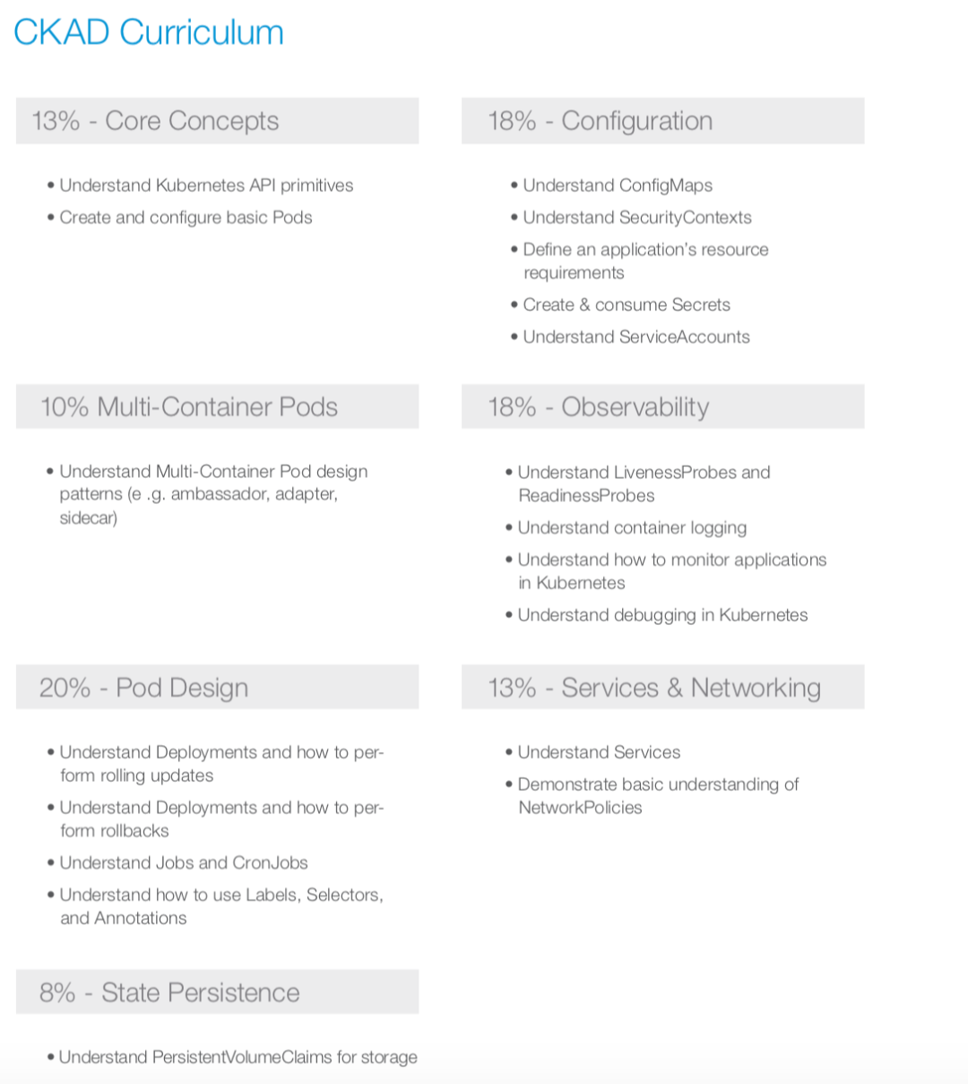 CKAD总体上看内容比CKA要少,其中Pod Design是大头,其他内容个人感觉和CKA内容很大部分是重叠的,不过二者考察的方向不一样。