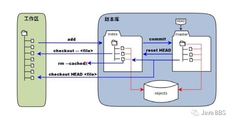 图中的 objects 标识的区域为 Git 的对象库,实际位于 ".git/objects" 目录下,里面包含了创建的各种对象及内容。