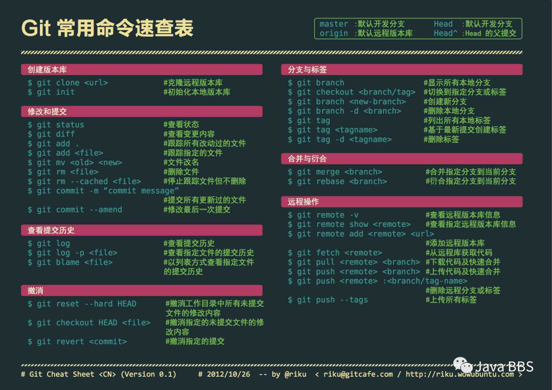 [root@server12 ~]# git init # 初始化[root@server12 ~]# git add main.cpp # 将某一个文件添加到暂存区[root@server12 ~]# git add . # 将文件夹下的所有的文件添加到暂存区[root@server12 ~]# git commit -m ‘note‘ # 将暂存区中的文件保存成为某一个版本[root@server12 ~]# git log # 查看所有的版本日志[root@server12 ~]# git status # 查看现在暂存区的状况[root@server12 ~]# git diff # 查看现在文件与上一个提交-commit版本的区别[root@server12 ~]# git reset --hard HEAD^ # 回到上一个版本[root@server12 ~]# git reset --hard XXXXX # XXX为版本编号,回到某一个版本[root@server12 ~]# git pull origin master # 从主分支pull到本地[root@server12 ~]# git push -u origin master # 从本地push到主分支[root@server12 ~]# git pull # pull默认主分支[root@server12 ~]# git push # push默认主分支 ...