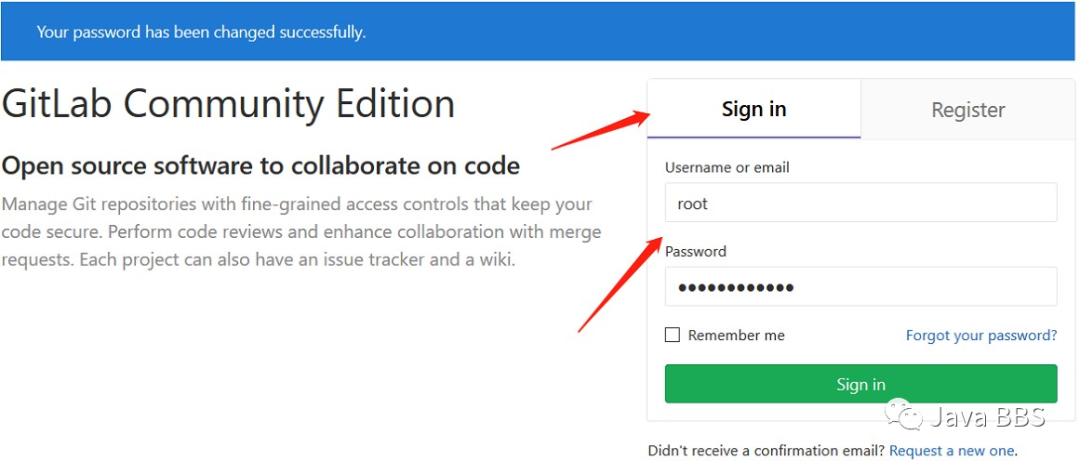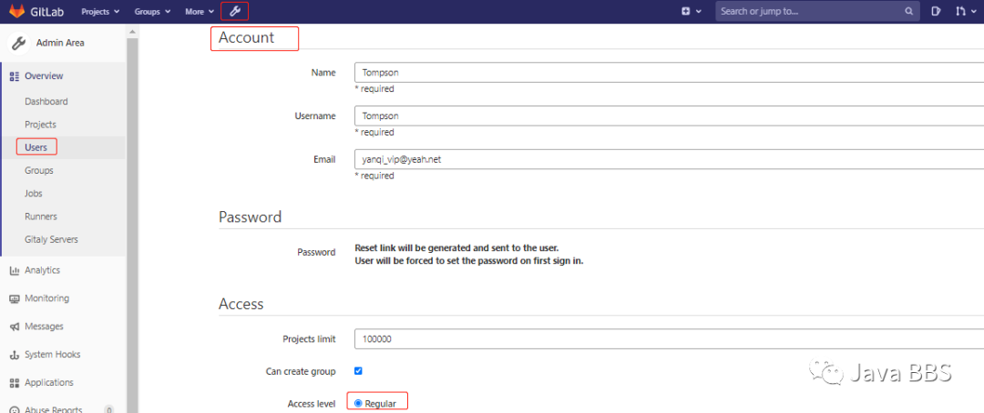 同样的方法,再创建 Eric 、Hellen 用户。用户添加完毕后,gitlab 会给用户发一封修改密码的邮件,各用户需要登录自己的邮箱,并点击相关的链接,设置新密码。