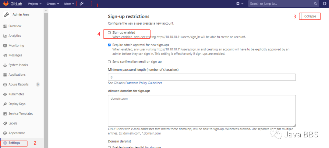 admin are -> settings -> Sign-up Restrictions 去掉钩钩,然后拉到最下面保存,重新登录