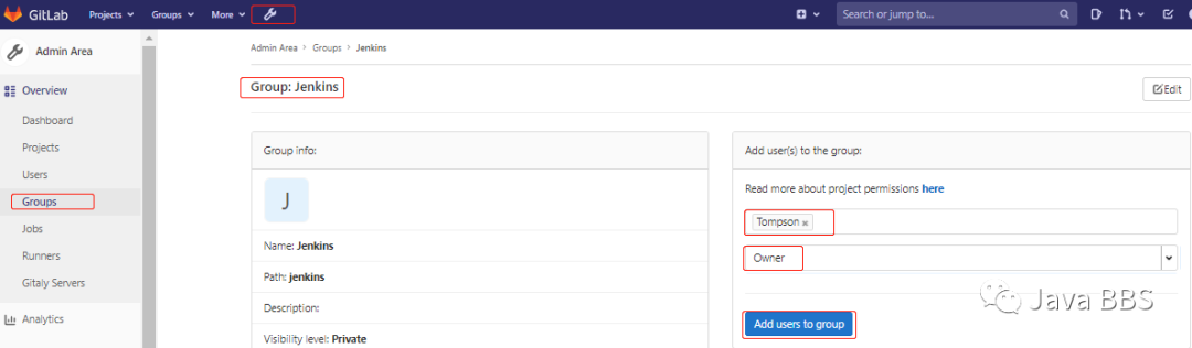 3、将 Tompson 用户添加到组中,指定T为本组的 owner