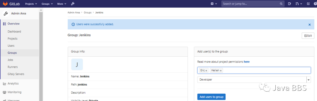 4、同样的方法将用户Eric、Hellen 添加到组中,并指定为Developer