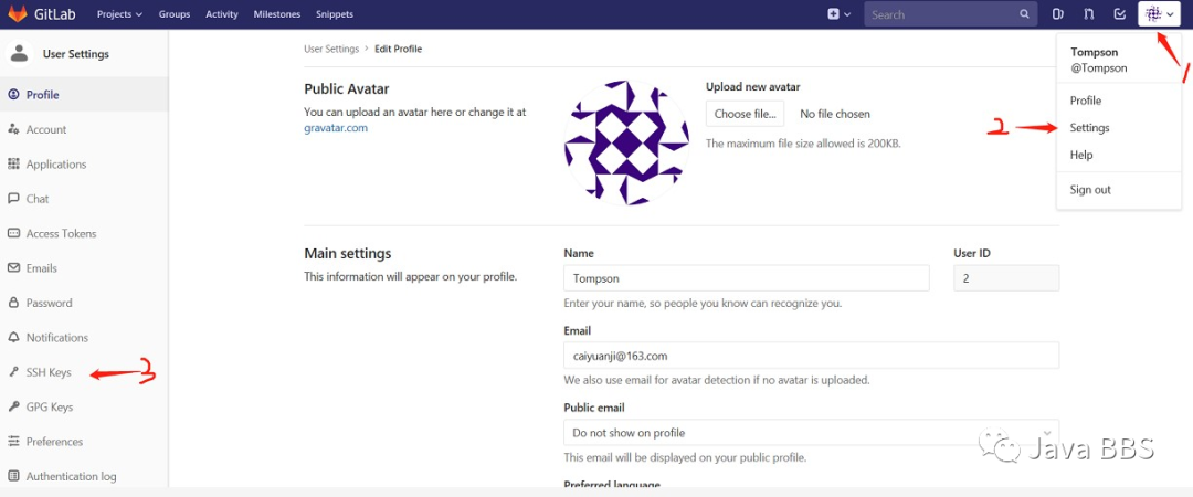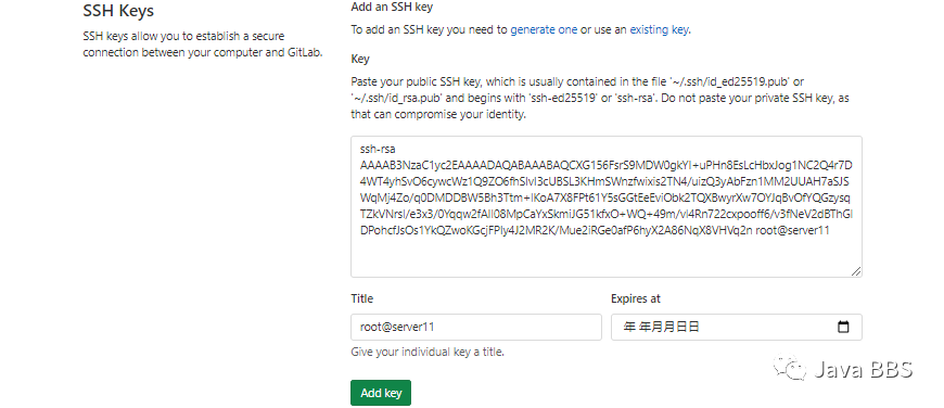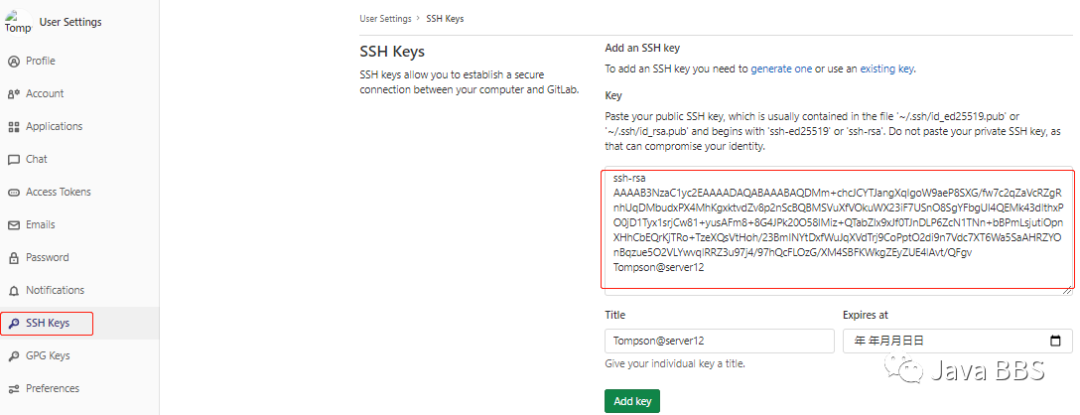 使用 Tompson 用户的身份与密码登录到 gitlab界面中,然后在 ssh-key 中添加相关的key 1
