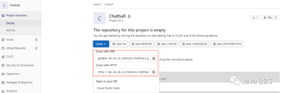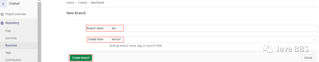 Projects——>Your Projects——>Jenkins——>Chathall——>New branch——>Branch name:dev——>Create branch