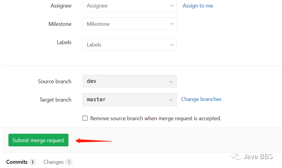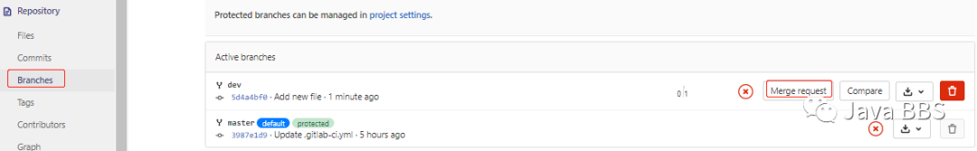 开发人员在gitlab界面上申请分支合并请求(Merge request)