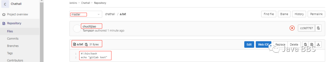 [Tompson@server12 ~]$ cd chathall/[Tompson@server12 chathall]$ vim a.txt#!/bin/bashecho "gitlab test"[Tompson@server12 chathall]$ git add a.txt[Tompson@server12 chathall]$ git commit -m 'chucitijiao'[Tompson@server12 chathall]$ git push -u origin masterCounting objects: 5, done.Delta compression using up to 2 threads.Compressing objects: 100% (2/2), done.Writing objects: 100% (3/3), 331 bytes | 0 bytes/s, done.Total 3 (delta 0), reused 0 (delta 0)To git@10.10.10.11:Jenkins/chathall.git2d6b585..cc9d775 master -> masterBranch master set up to track remote branch master from origin.