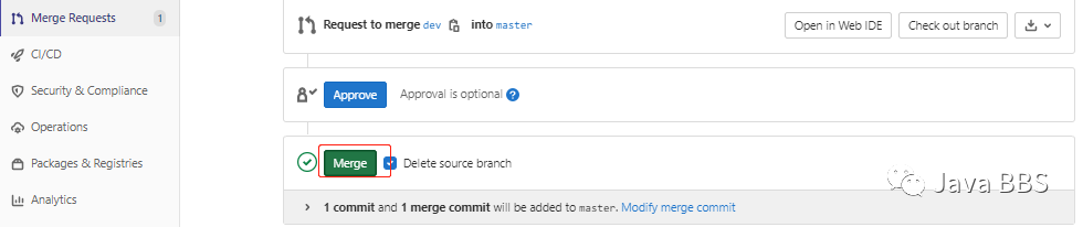 PM在gitlab上查看提交和代码修改情况,确认无误后,确认将开发人员的分支合并到主分支(master)