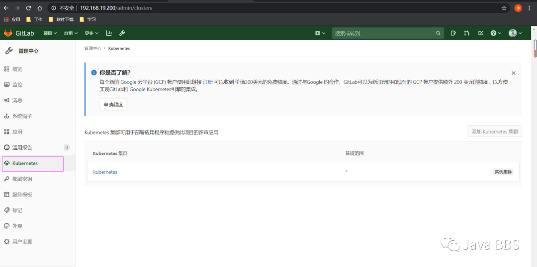 [root@server13 ~]# vim gitlab-admin-service-account.yamlapiVersion: v1kind: ServiceAccountmetadata:name: gitlab-adminnamespace: kube-system---apiVersion: rbac.authorization.k8s.io/v1beta1kind: ClusterRoleBindingmetadata:name: gitlab-adminroleRef:apiGroup: rbac.authorization.k8s.iokind: ClusterRolename: cluster-adminsubjects:- kind: ServiceAccountname: gitlab-adminnamespace: kube-system[root@server13 ~]# kubectl apply -f gitlab-admin-service-account.yamlserviceaccount/gitlab-admin createdclusterrolebinding.rbac.authorization.k8s.io/gitlab-admin created
