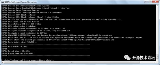 ⑥在cmd进入项目所在的根目录,输入命令:sonar-scanner,分析成功后会出现下图