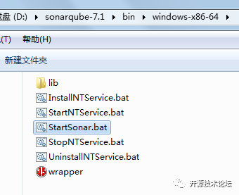 启动SonarQube:启动文件夹bin内包含在各种平台上对应不同启动文件。本人计算机为windows64位,点击进入选择StartSonar.bat点击进行启动