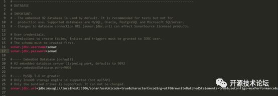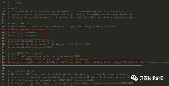 将SonarQube解压后,其中conf/sonar.properties配置其数据库信息。需要配置以下属性: