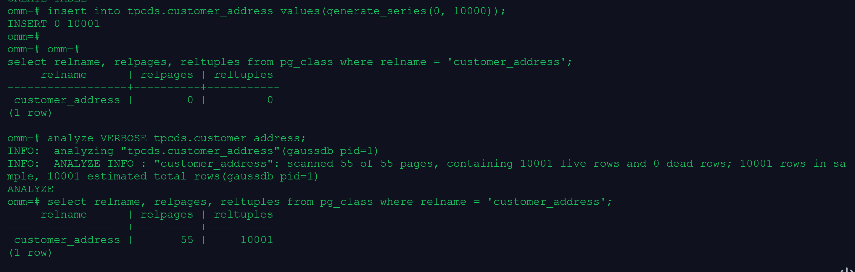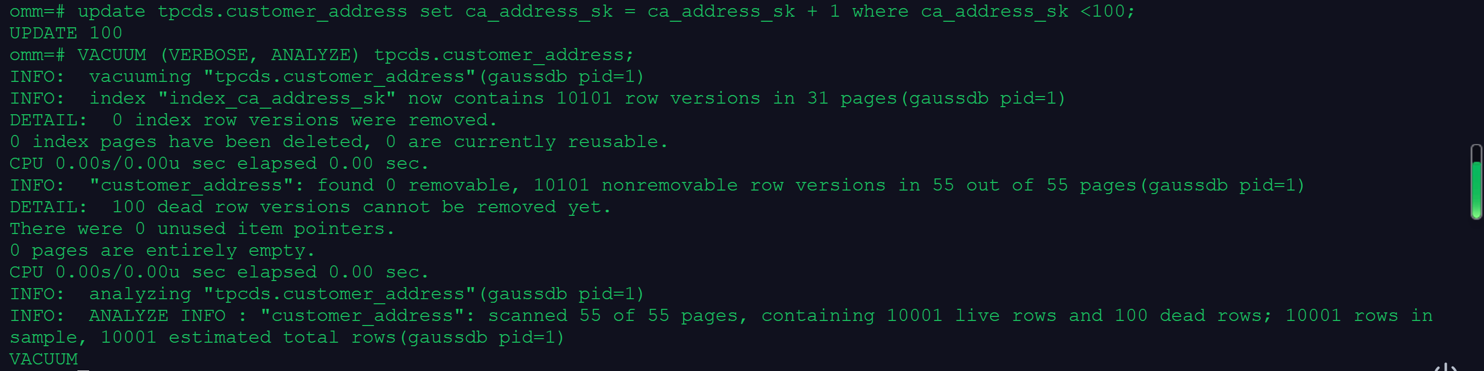 VACUUM (VERBOSE, ANALYZE) tpcds.customer_address;