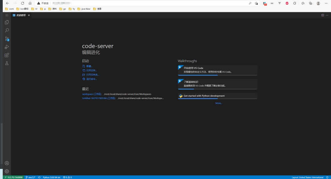 [2021-01-08T15:53:58.789Z] info code-server 3.8.0 c4610f7829701aadb045d450013b84491c30580d[2021-01-08T15:53:58.794Z] info Using user-data-dir ~/.local/share/code-server[2021-01-08T15:53:58.817Z] info Using config file ~/.config/code-server/config.yaml[2021-01-08T15:53:58.818Z] info HTTP server listening on <http://0.0.0.0>:你设置的端口[2021-01-08T15:53:58.819Z] info - Authentication is enabled[2021-01-08T15:53:58.819Z] info - Using password from ~/.config/code-server/config.yaml [2021-01-08T15:53:58.820Z] info - Not serving HTTPS