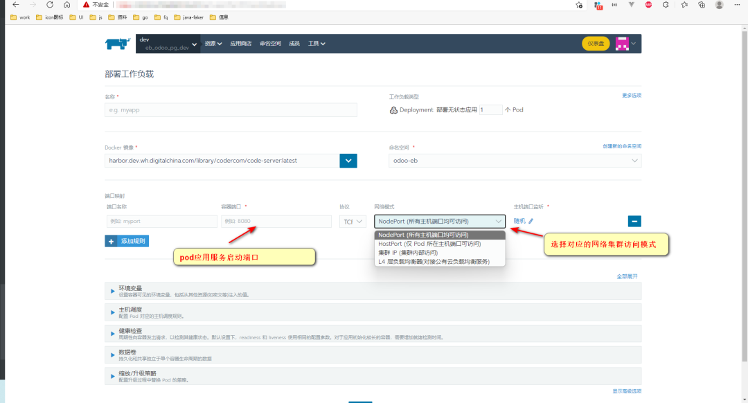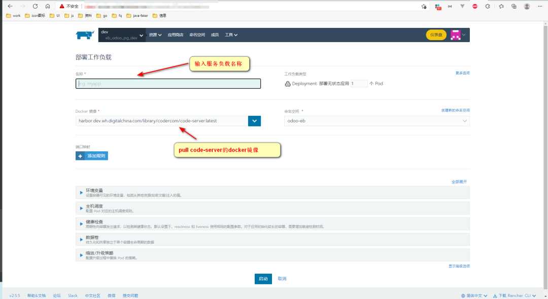 网速较慢可以通过国内的镜像源 pull,设置好pod 资源 deploy 应用,选择已经创建好的命名空间即可。