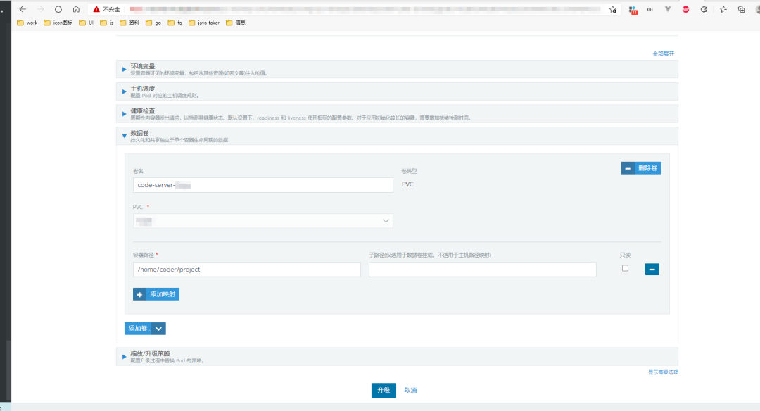 若还没新建 PVC ,可以通过添加卷方式或者通过 Rancher 资源的 PVC 设置,添加好数据卷。