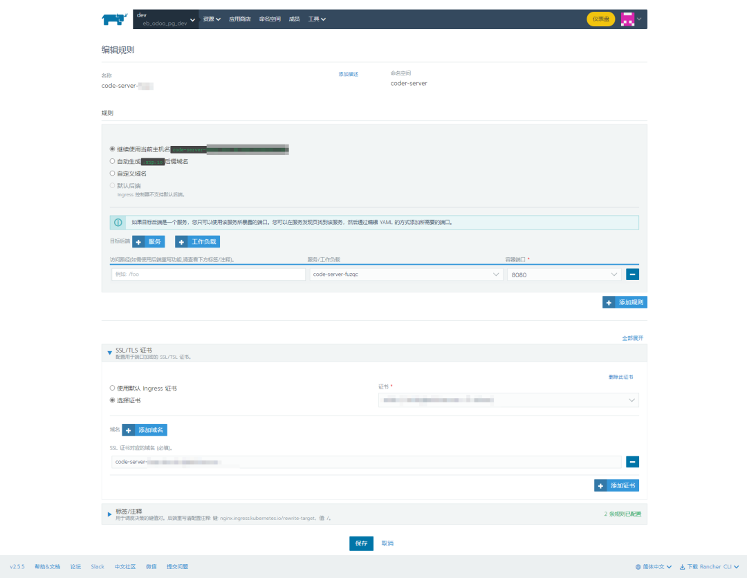 SSL/TLS 证书这里我使用已经导入配置好的证书和对应域名,自定义 K8S 集群按照自己配置好的证书和域名使用即可。
