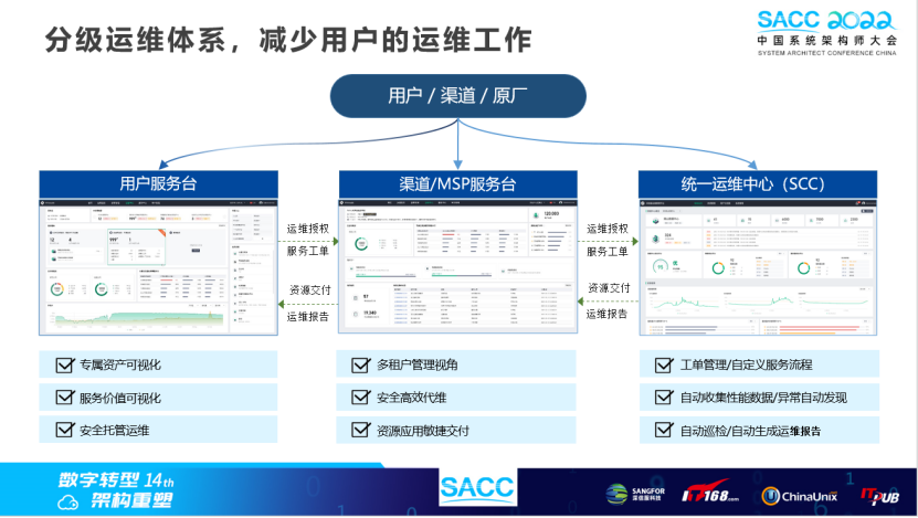 在运维层面,为了简化用户操作,信服云将运维分成了三个层级。一是用户服务台,提供给用户一些可视化的运维工具,让用户可以进行基础的运维工作。二是渠道和云服务商运维平台,提供多租户管理、安全高效代维、资源应用敏捷交付、故障排查工具等功能,帮助用户完成更复杂的运维工作。三是统一运维中心,由信服云强大的运维团队在实现运维链条闭环的同时,提供专家级的服务。