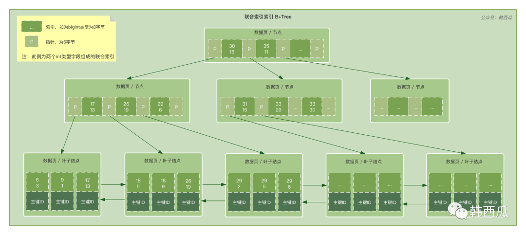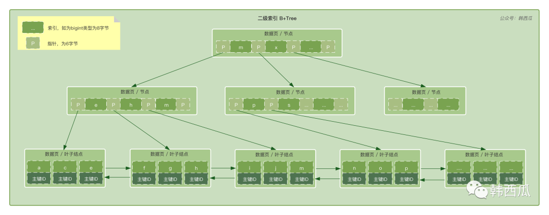 假设我们一行数据大小为1K,那么一页就能存储16条数据,也就是一个叶子节点能存16条数据,假设索引列是bigint类型,那么长度为8B(byte),指针大小在InnoDB的源码中为6B,一共就是14B,那么一页里就可以存 16KB/14B = 1170.