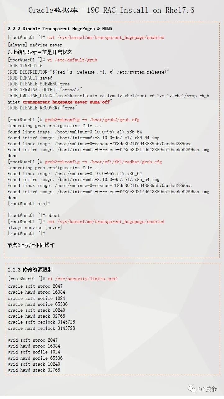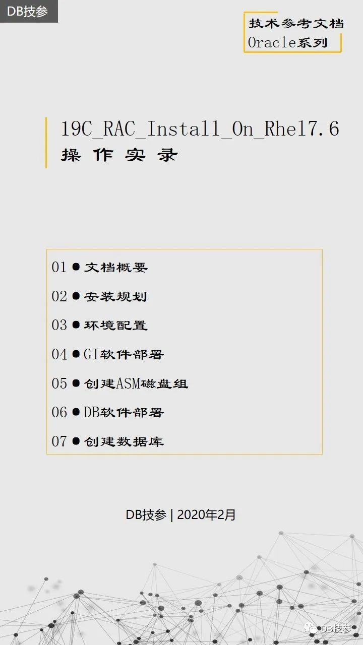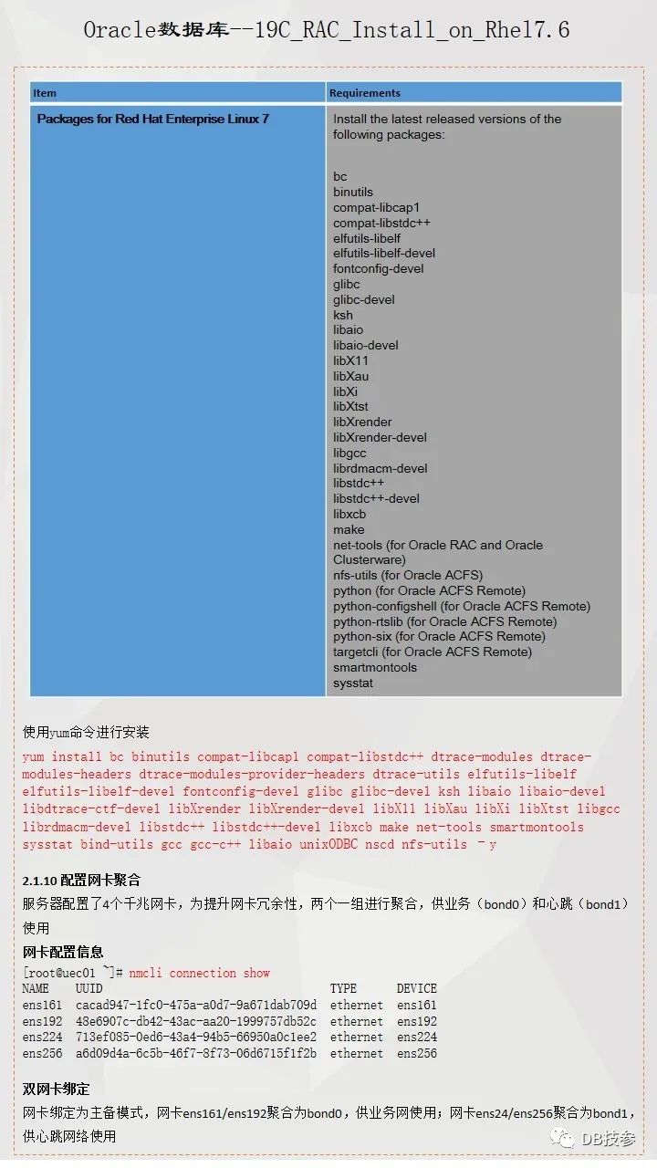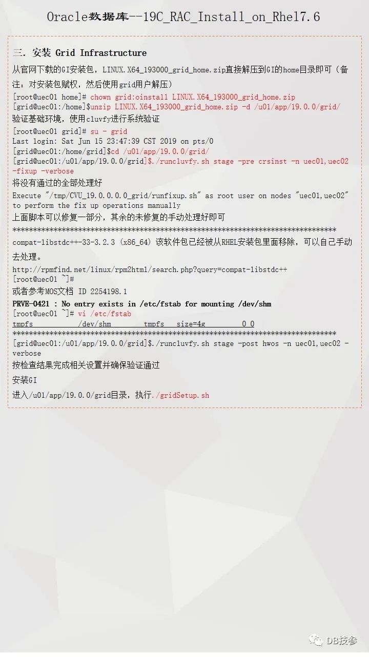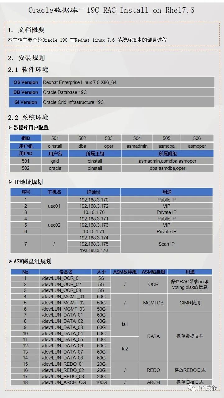 本文档主要介绍Oracle 19C 在Redhat Linux 7.6系统上的一个安装部署过程,给大家一份参考,Oracle RAC 安装部署是比较简单的一个工作,但一些新人在处理的时候总会遇到这样或者那样的问题,其实大部分都是一个原因,即基础环境配置上没有处理好,所以对于这个文档,重点看下前面系统环境配置,后面软件安装部分鼠标点点点的事情了。