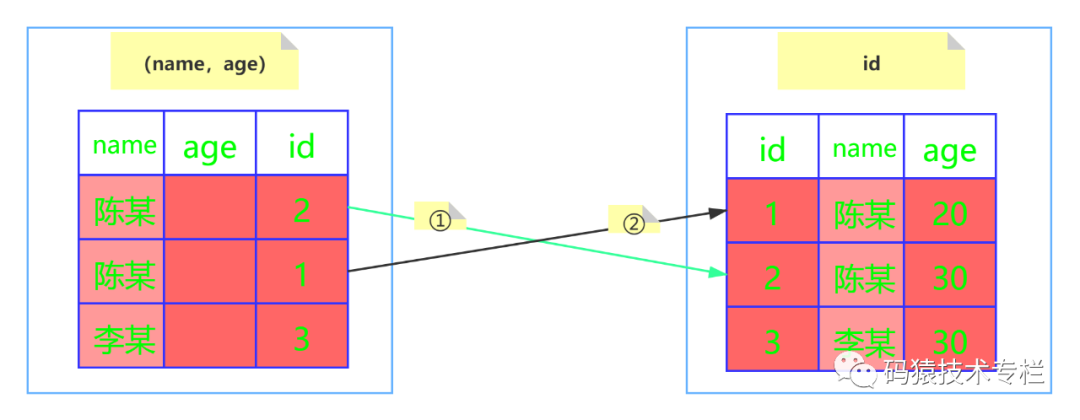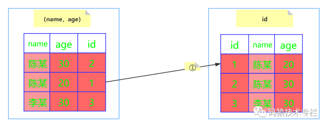 会忽略age这个字段,直接通过name进行查询,在(name,age)这课树上查找到了两个结果,id分别为2,1,然后拿着取到的id值一次次的回表查询,因此这个过程需要回表两次。